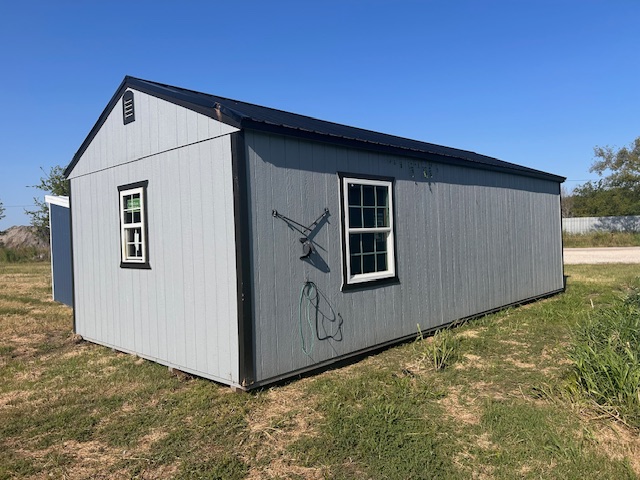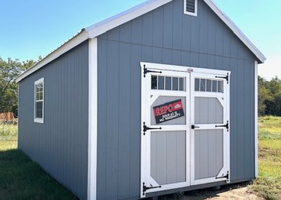 This Repo 12×24 Utility shed is in excellent condition. It features a charming Cape Cod Gray and white exterior, complete with transom windows in the double doors. This shed offers great value, as you can save over $2,235.00 compared to buying it new.